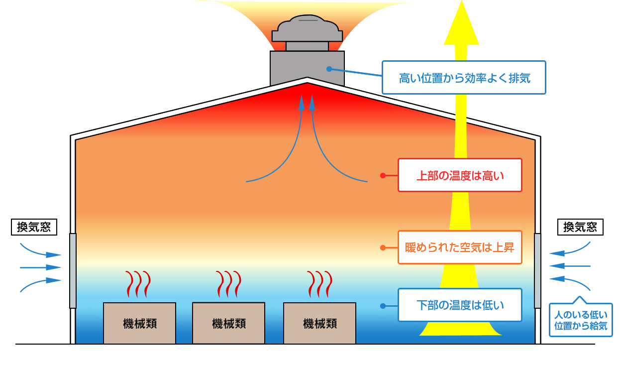 暖かい空気は冷たい空気より軽いため、自然と上昇します。 この性質を利用することで、室内の熱気を効率的に排出し、温度上昇を抑えることができます。